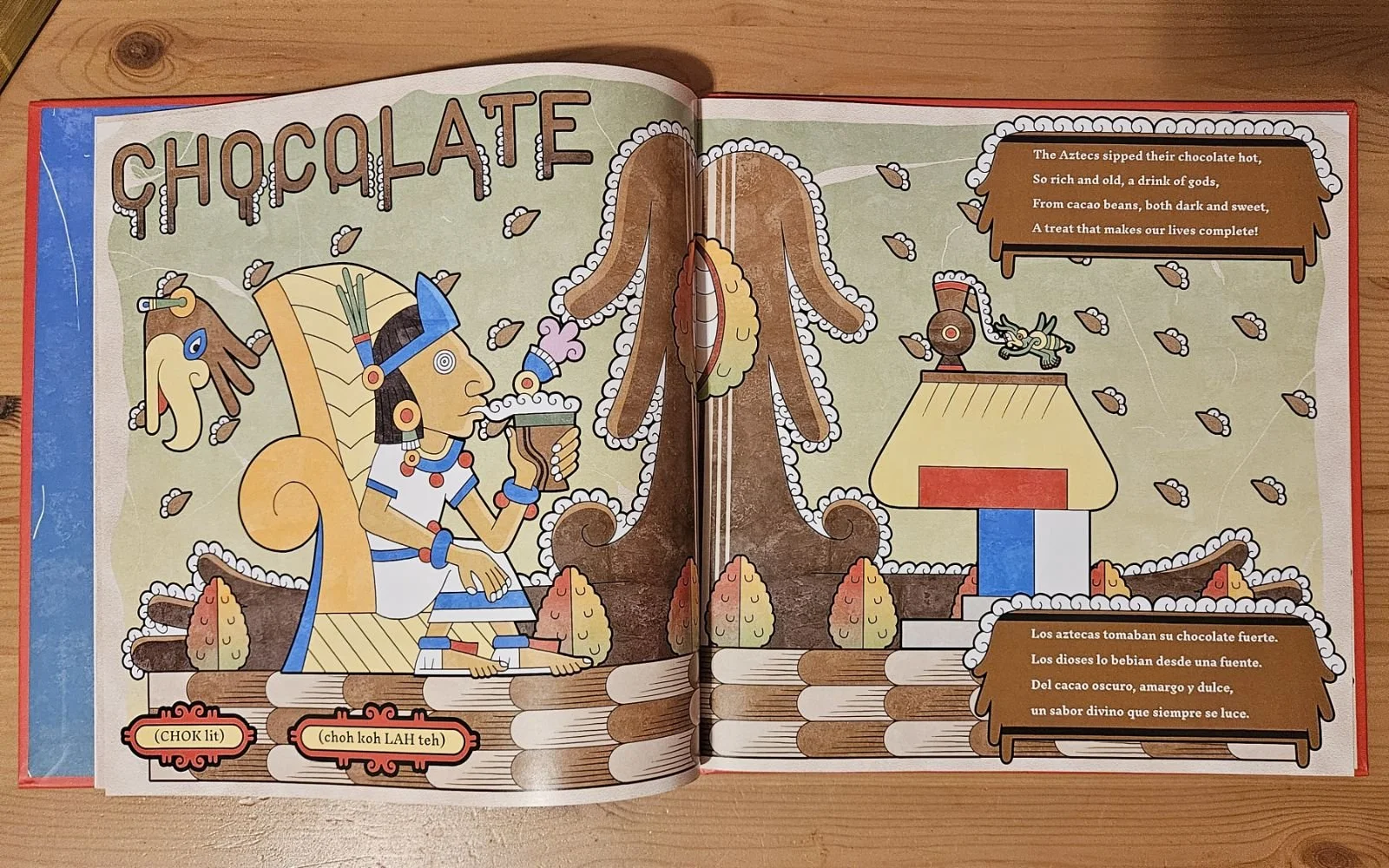 Years later, I went to the university for graphic design while infusing my own knowledge of the culture. So when the book idea for A-Ztec: A Bilingual Alphabet Book came along, it was great and also a challenge because in Aztec vocabulary, some English-alphabet letters do not exist. For example, K or W. My editor was a huge help [inserting words for letters that do not exist in the Aztec alphabet].